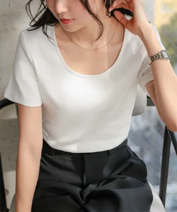 [ M L XL 選べるサイズ ] 深Uネック細リブ半袖Tシャツ [C7463]