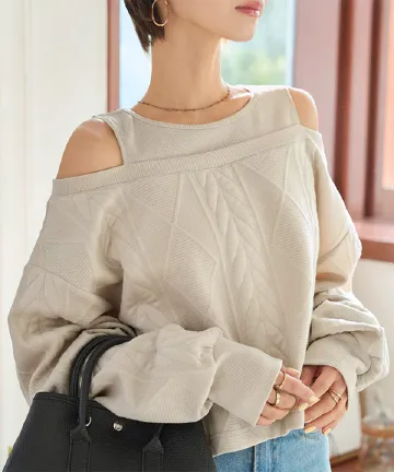 レイヤード風ケーブルデザインオフショルトップス [C7754]